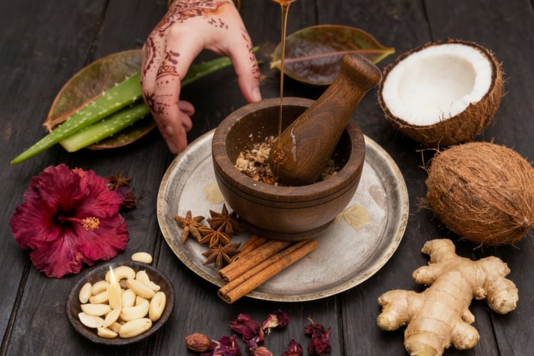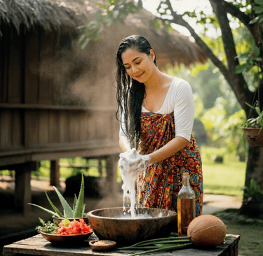 Traditional Malay hair rituals often combine coconut milk with flowers or essential oils for deep scalp treatments. Hibiscus leaves and aloe vera are also beloved for their moisturizing benefits, while sesame oil and candlenut oil serve as popular alternatives for scalp massages. Some traditional spa recipes even include betel and henna leaves to help cool the scalp, ease headaches, and reduce dandruff.