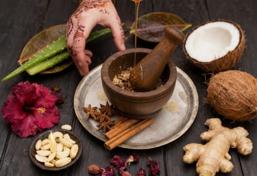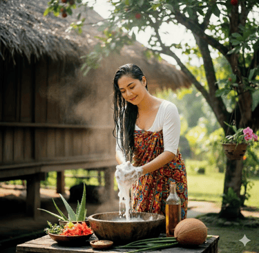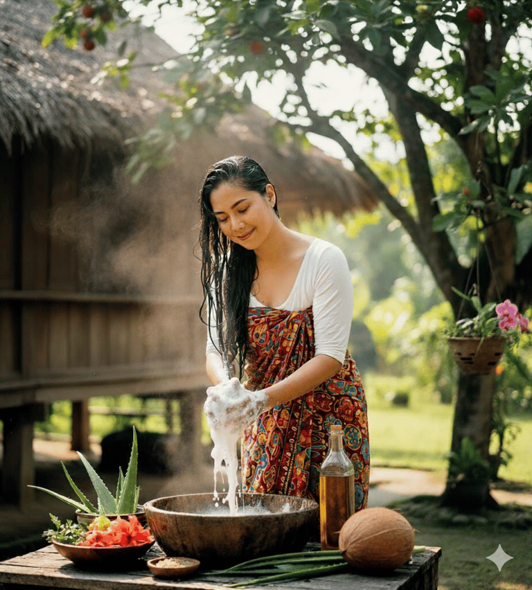 Traditional Malay hair rituals often combine coconut milk with flowers or essential oils for deep scalp treatments. Hibiscus leaves and aloe vera are also beloved for their moisturizing benefits, while sesame oil and candlenut oil serve as popular alternatives for scalp massages. Some traditional spa recipes even include betel and henna leaves to help cool the scalp, ease headaches, and reduce dandruff.